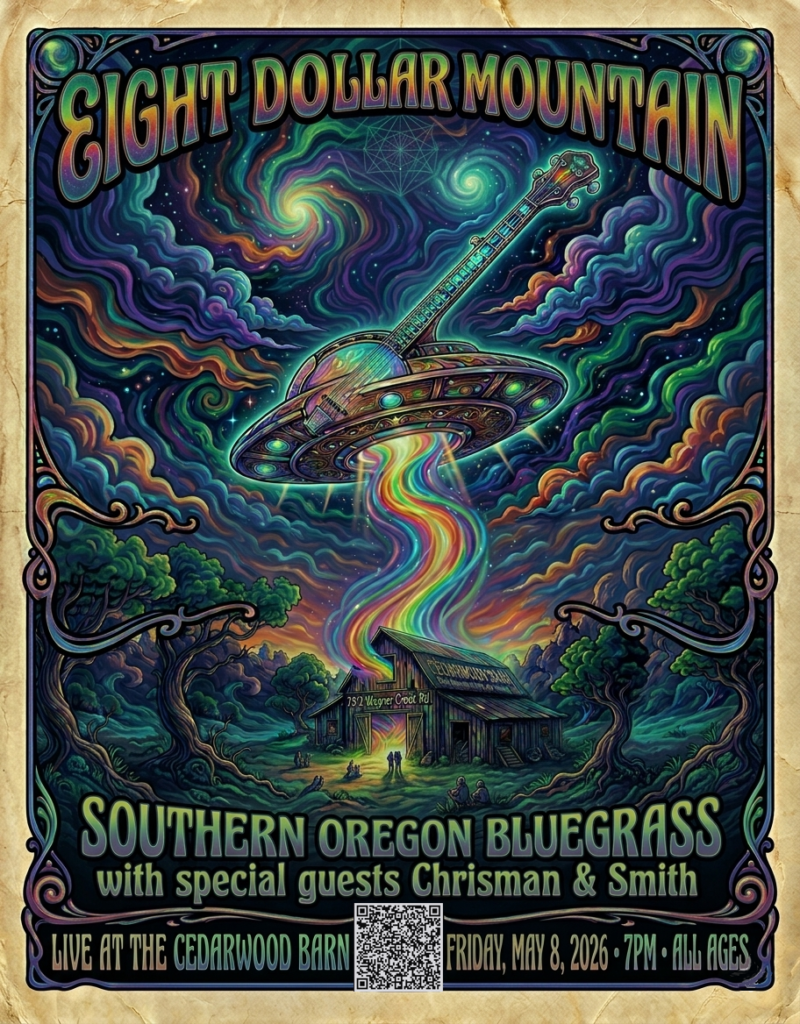 Southern Oregon’s own Eight Dollar Mountain has been delivering their high-energy take on bluegrass for over 15 years to audiences up and down the West Coast. Their hard-driving rhythm pulls you onto the dance floor, with a clear, purposeful sound reflecting the roots of mountain music, blues, and old time country. The seasoned quartet weaves together a compelling blend of original music, traditional tunes, and fun cover songs, all with a fresh, dynamic approach that’s uniquely their own. Eight Dollar Mountain sounds familiar, like the tunes coming from grandpa’s back porch, yet their energy carries the bluegrass tradition into the 21st century.